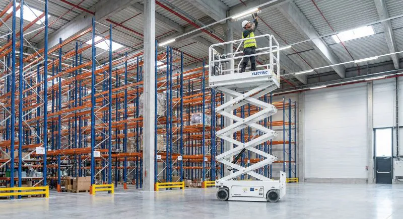Légende : La nacelle ciseaux électrique permet d’atteindre des plafonds complexes sans encombrer le sol, idéal pour les malls et usines.